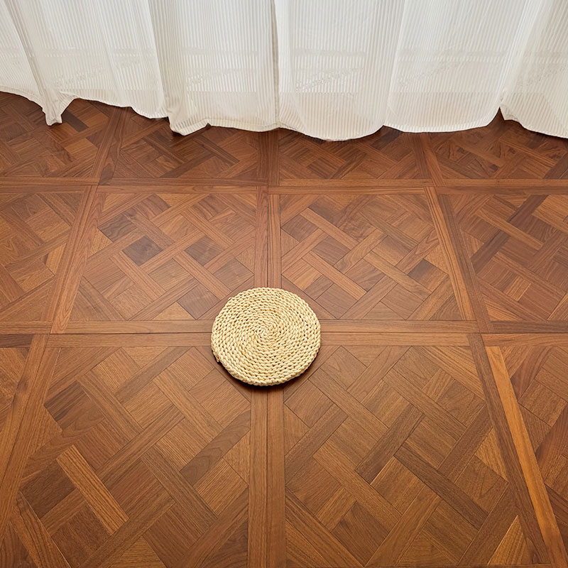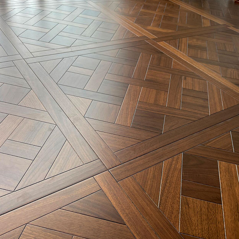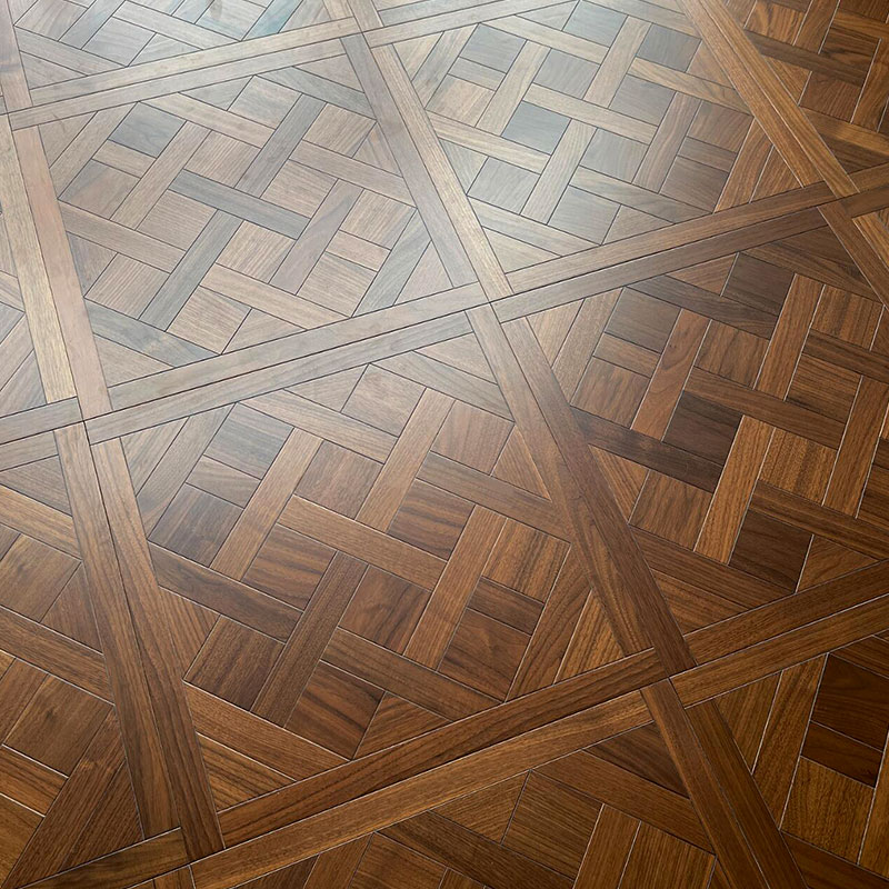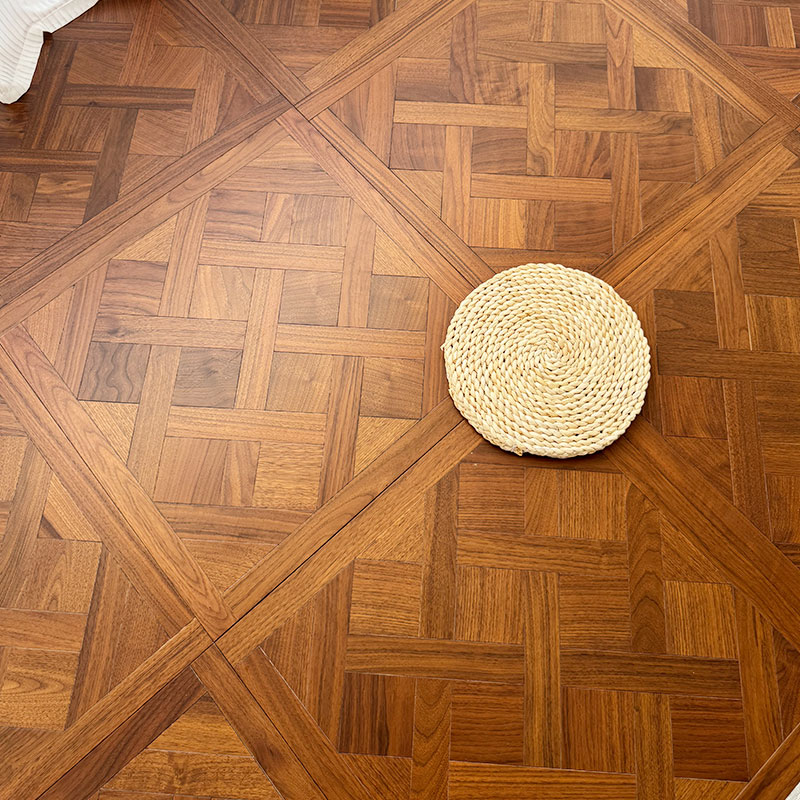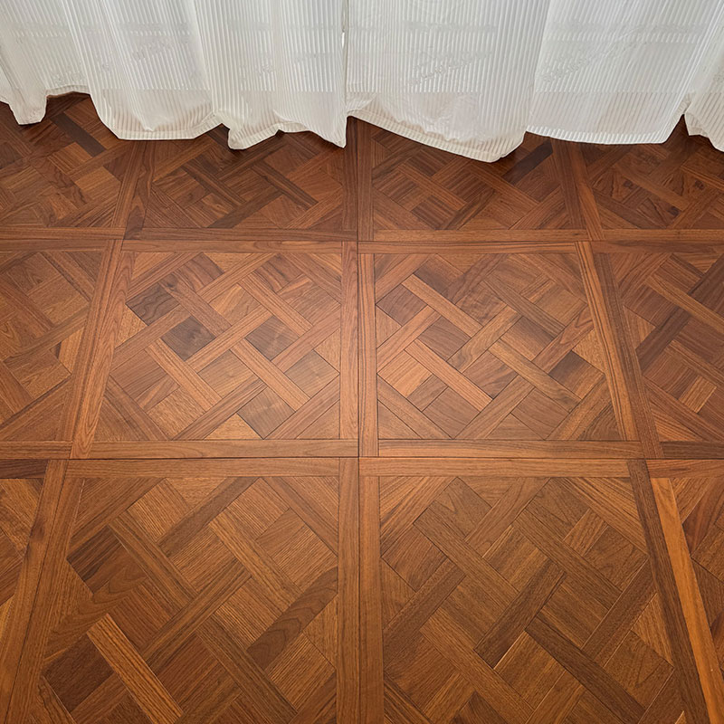 The Black Walnut Versailles pattern flooring combines classic European artistry with modern engineering. Sourced from premium North American black walnut, each panel features a unique 1.2mm solid wood veneer, offering rich, dark hues and distinctive grain patterns that bring timeless elegance to any space.