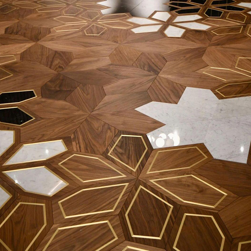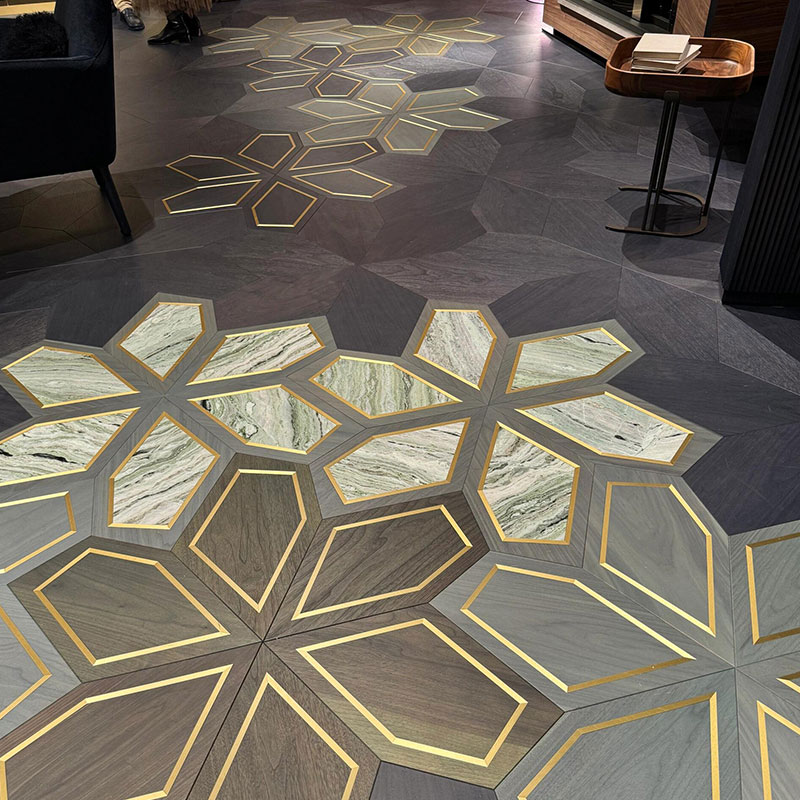 Inspired by geometric artistry, the Black Walnut Pentagon flooring offers a modern twist on classic parquet design. Each piece is precision-cut into a distinctive pentagon shape (334.77*193.28mm), creating dynamic visual patterns when installed. The luxurious 1.2mm top layer of North American black walnut is known for its deep, chocolate-brown color and elegant grain, providing a sophisticated backdrop for any interior.Built with an all-birch multilayer core, this flooring achieves superior structural stability and is fully compatible with underfloor heating systems, resisting deformation under temperature changes. The 15mm thickness ensures solidity underfoot and contributes to effective sound insulation.