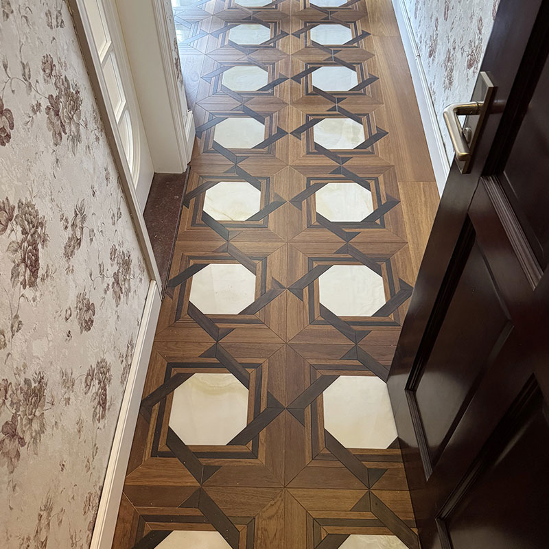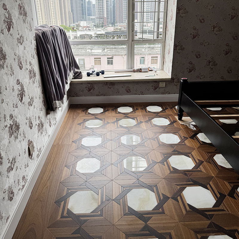 Each 450×450mm tile is meticulously crafted with a 1.2mm veneer of genuine wood and stone materials, assembled using precise flat wire-inlaid techniques that highlight the distinct characteristics of each material while ensuring a smooth, seamless surface. The multi-layer solid wood base provides outstanding stability, making it fully compatible with underfloor heating systems.