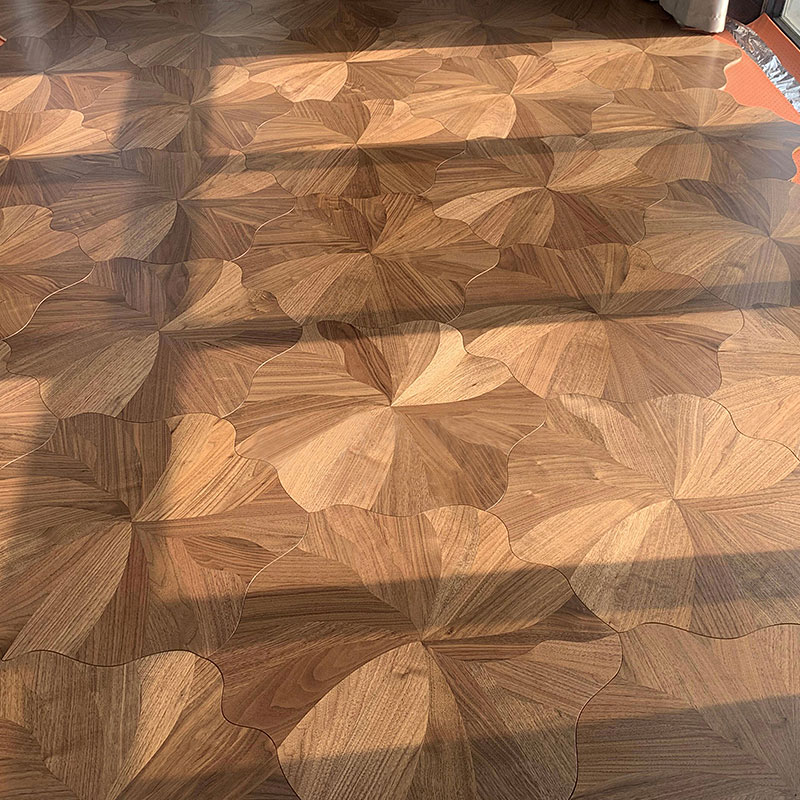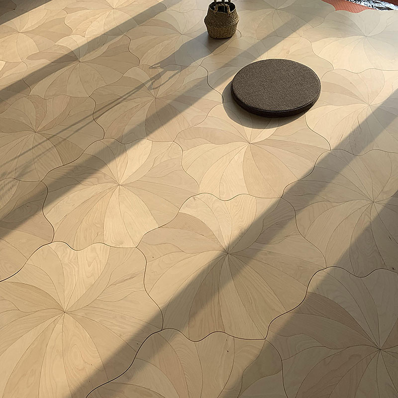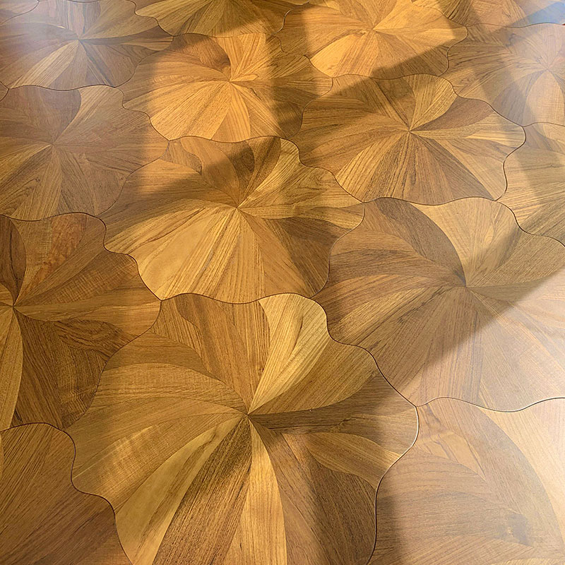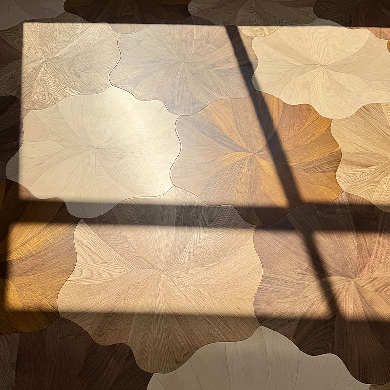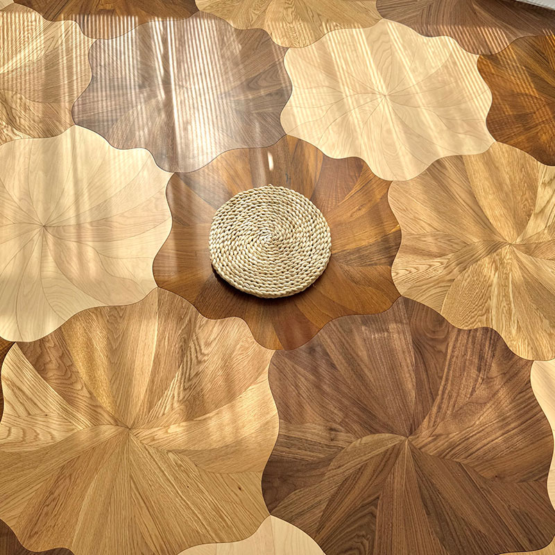 Inspired by the elegant form of lotus flowers in nature, this innovative parquet collection redefines artistic expression in flooring through its unique interlocking petal design. The set features four complementary wood species—Oak, Teak, Birch, and Black Walnut—each contributing its distinctive grain and tone to create a harmonious, visually captivating surface.