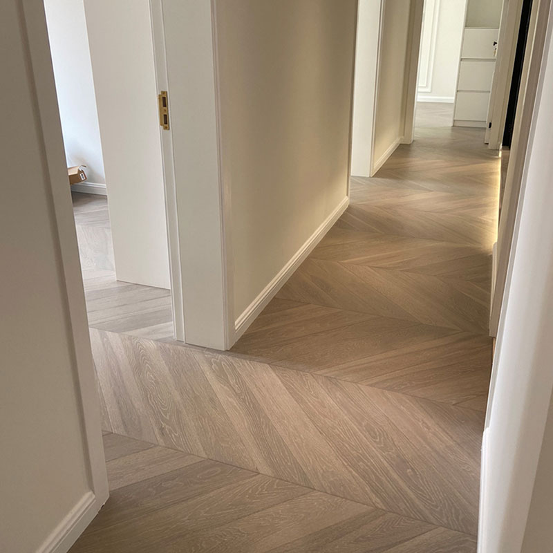 The Oak Herringbone pattern revives a classic European architectural tradition, where the precise 45-degree angle installation creates dynamic visual rhythm and timeless elegance. This new three-layer solid wood construction combines the authentic beauty of natural oak with enhanced engineering stability.Each module measures 510×90mm with a 15mm thickness, optimized for the distinctive herringbone layout while ensuring efficient installation with the advanced lock system. The surface features a subtle wire-brushed finish that accentuates the natural grain of European oak, offering both visual depth and enhanced tactile resistance to daily wear.Specially designed for modern living environments, this flooring maintains excellent dimensional stability suitable for use with underfloor heating systems. The multi-layer structure effectively minimizes wood expansion and contraction, providing reliable performance across seasonal changes.